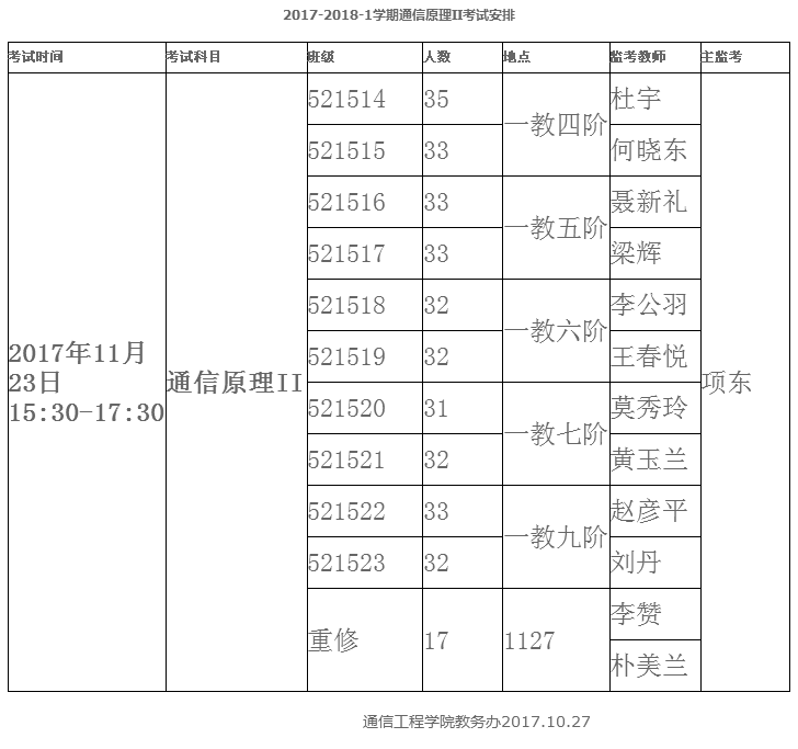 2017-2018-1学期通信原理II考试安排
