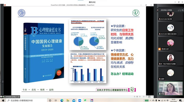 Ms. Bai began the lecture by introducing Chinese people’s mental health conditions. She presented the current mental health condition of adults and enrolled students through detailed and accurate data. Then she proposed two questions, i.e. “What will our life be?” and “What should we do?”. Based on the reality among students, Ms. Bai indicated two key factors causing the anxiety of contemporary postgraduate students. While drawing students’ attention, she used vivid cases and short videos to offer solutions to problems. In addition, she gave a more detailed explanation on how to achieve self-management by managing the goal, the time and the pressure, and how to make good use of resources of knowledge, social connections, and profession. Finally, Ms. Bai elaborated on many methods to deal with and mitigate pressure that emerged from circumstances such as the adaptive crisis, interpersonal relationships, and lack of confidence. It vividly explained how to establish good relationships, enhance students’ empathy in interpersonal communication, and enabled them to adapt to campus life quicker and better.
