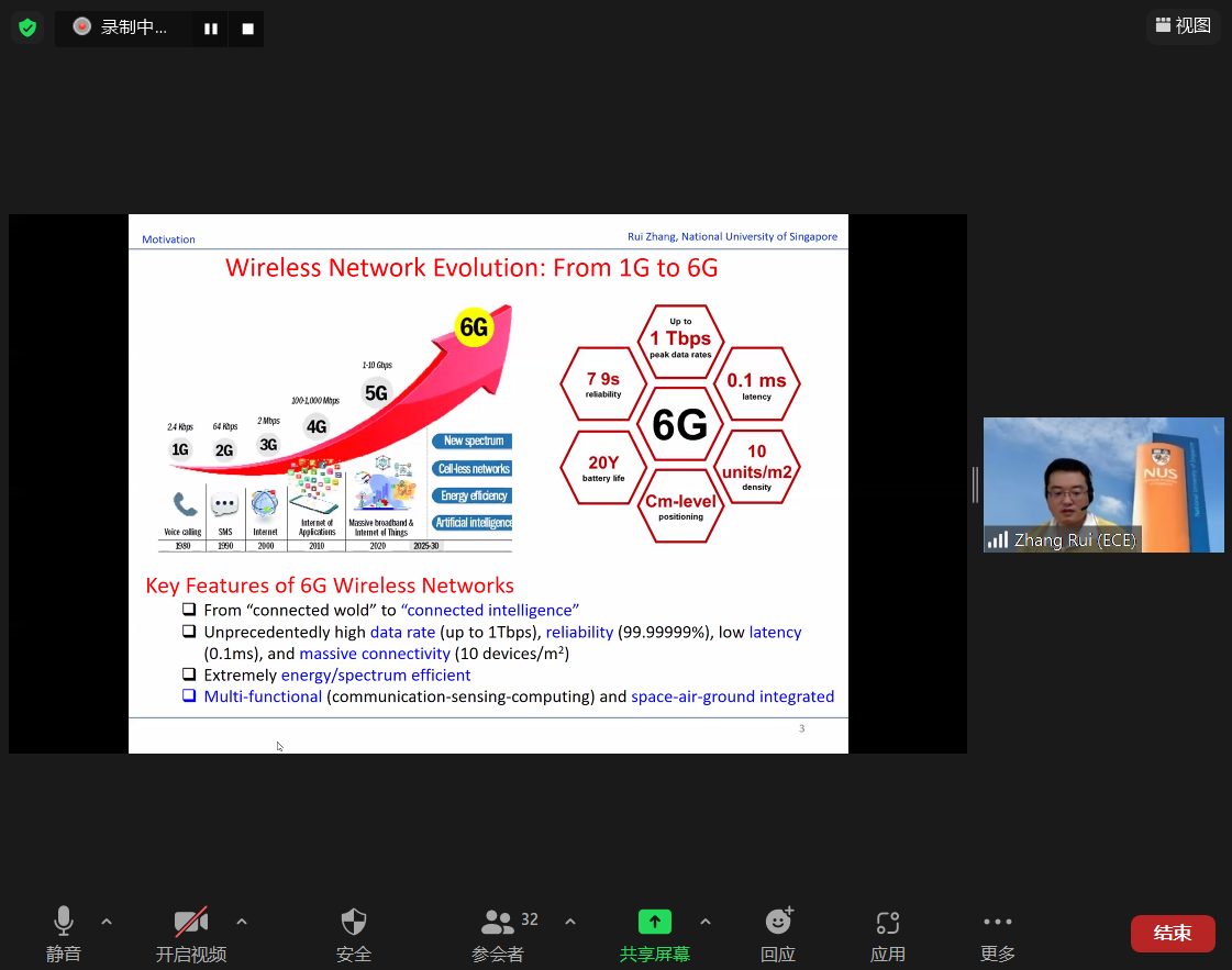 At the conference, Professor Hu Fengye extended gratitude toward the four experts and other colleagues for their support to the development of the College, and sincerely expected the visit of experts and cooperation in the future. Professor Rui Zhang then gave an academic report themed Intelligent Reflecting Surface (IRS) for 6G: Opportunities and Challenges. The report highlighted the latest results for dual/multi-IRS assisted wireless networks. By introducing the key functions and applications of IRS in achieving spectrum and energy-efficient wireless networks, the speech emphasized the distinctive advantage of IRS in its lower cost and better performance compared with the current wireless technology. It also discussed the main design challenges for effective integration of IRS into future wireless networks such as 6G, including passive reflection optimization, IRS communication channel capture and IRS deployment, and outlined the most advanced solutions to them.