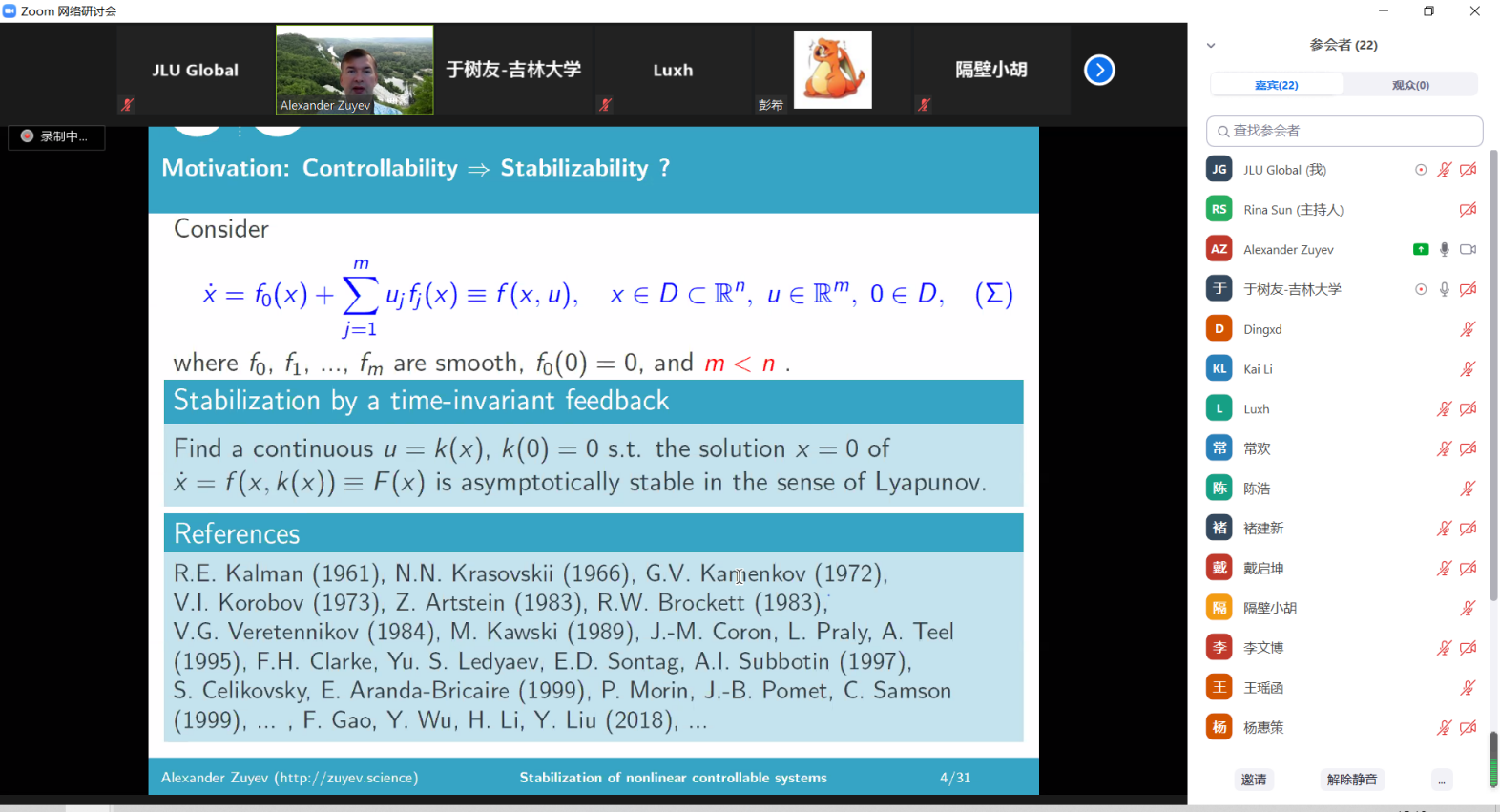 Zuyev 教授发表了题为"Stabilization of nonlinear controllable systems by fast oscillating controls" 的学术报告。他就振动控制稳定条件的研究进行了简要的介绍, 并对其稳定性和控制性进行了深度的讨论。会上,Zuyev 也对非完整系统和指数稳定结果以及 Obstacle Avoidance Problem(避障问题)从问题组成到功能和实例都进行了耐心地讲解。